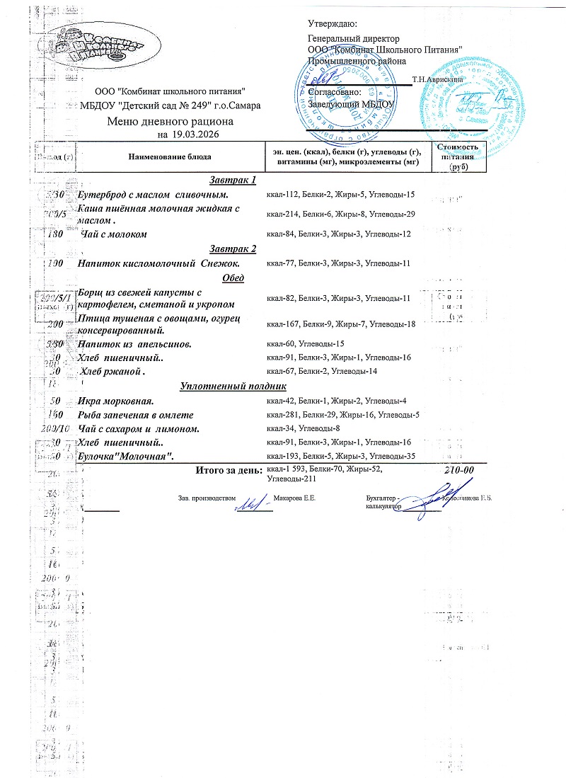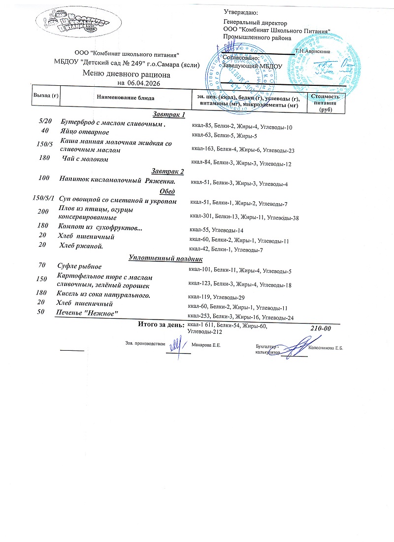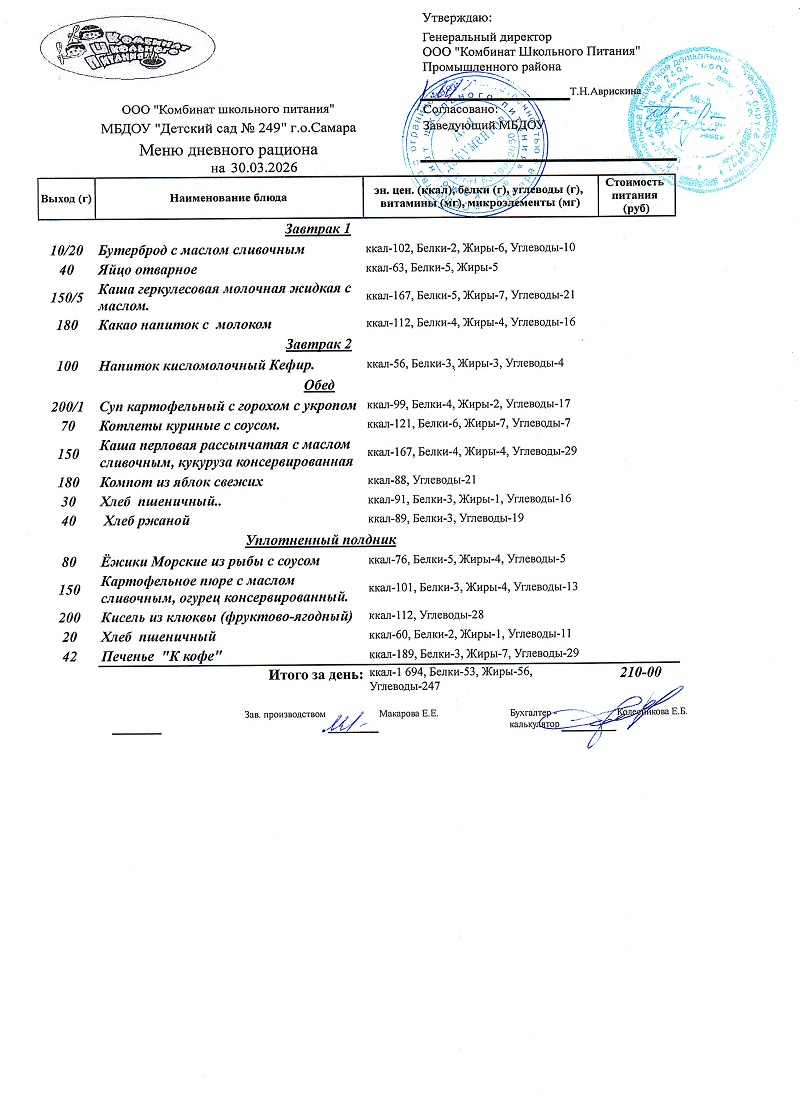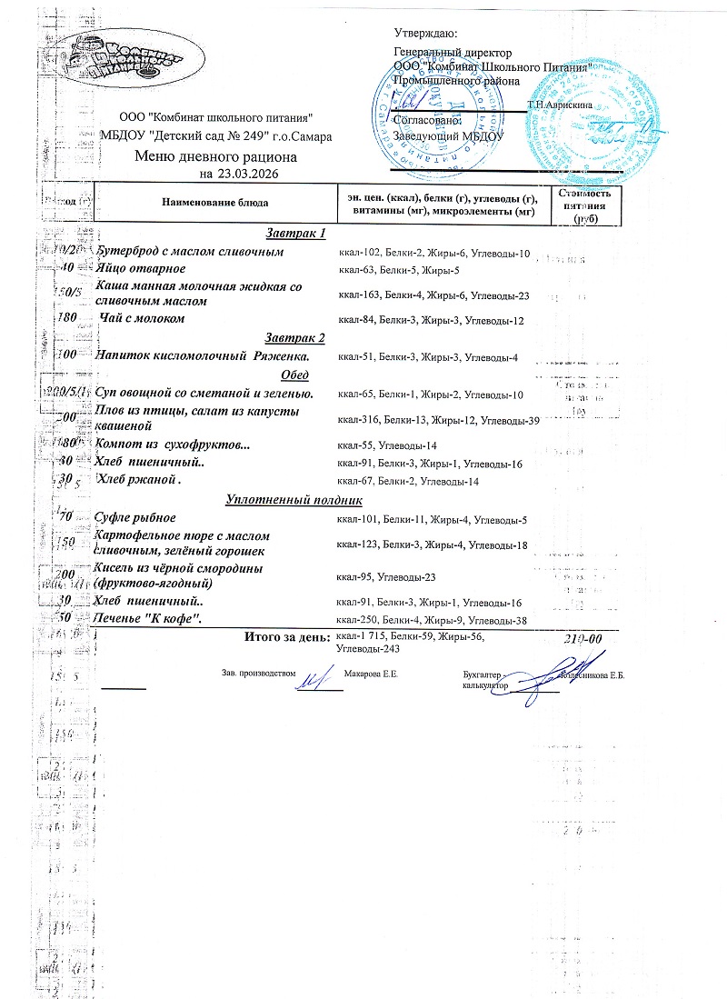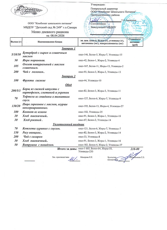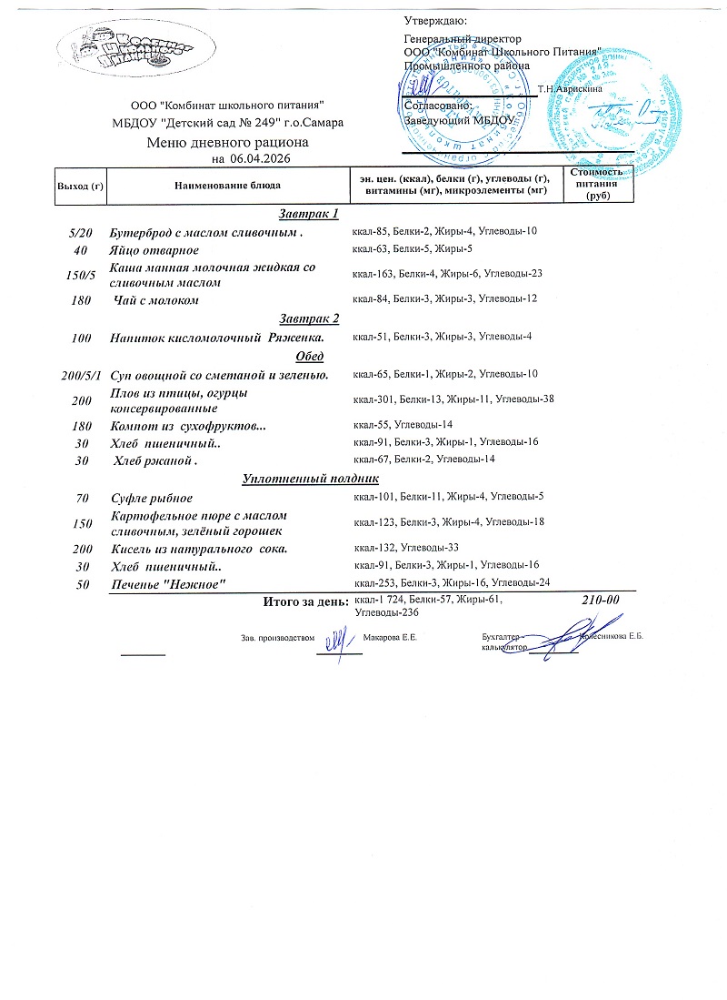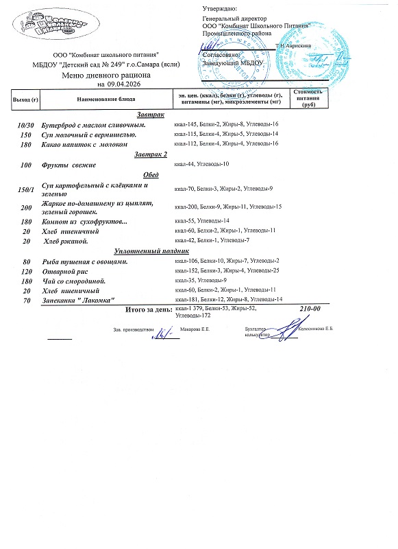 В МБДОУ «Детский сад № 249» г.о. Самара организуется питание в соответствии с действующим СанПиН.